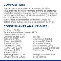 Viandes et sous-produits animaux (poulet 15 %), extraits de protéines végétales, céréales, sous-produits d’origine végétale, légumes, huiles et graisses, graines, minéraux, lait  et sous-produits de lait (hydrolysat de protéines de lait 0,1%).