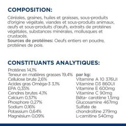 - Niveau faible en phosphore et Ă©levĂ© en OmĂ©ga-3, vitamine E et EPA contribuant au bon fonctionnement des reins et du cĹ“ur et renforçant le mĂ©tabolisme.Â